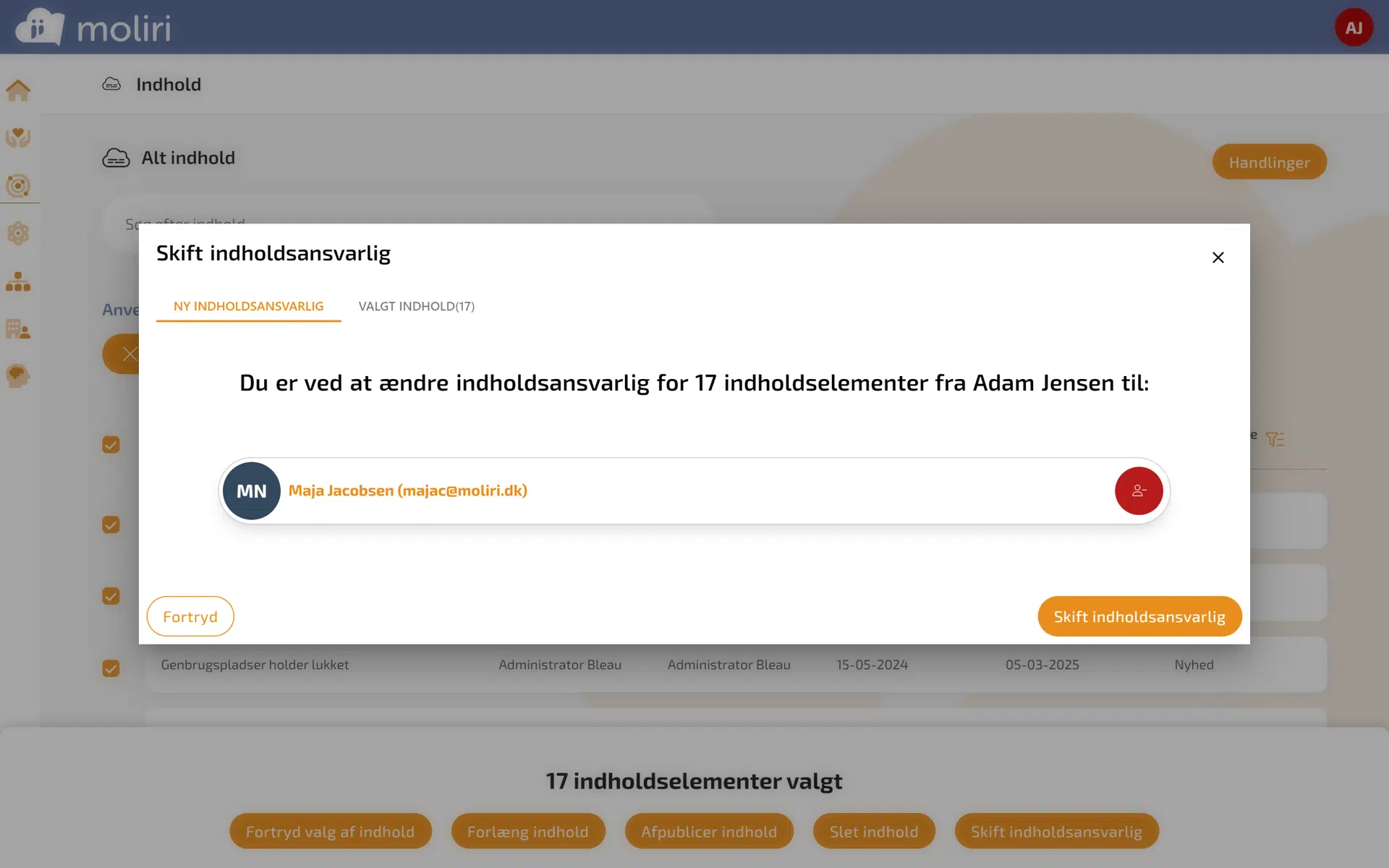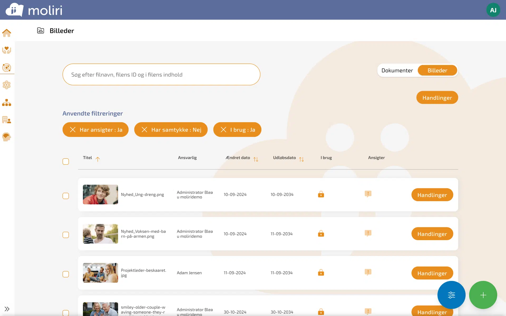 Når du har brugt filtreringsmulighederne til at fremfinde det du søgte, kan du bruge massehandlinger til at bestemme, hvad der skal ske med elementerne. Flyt, slet, skift ansvarlig, forlæng udløbsdato, og meget andet. Massehandlinger sparer dig tid og ressourcer, både når du skal administrere indhold, billeder, dokumenter, og formularbesvarelser.