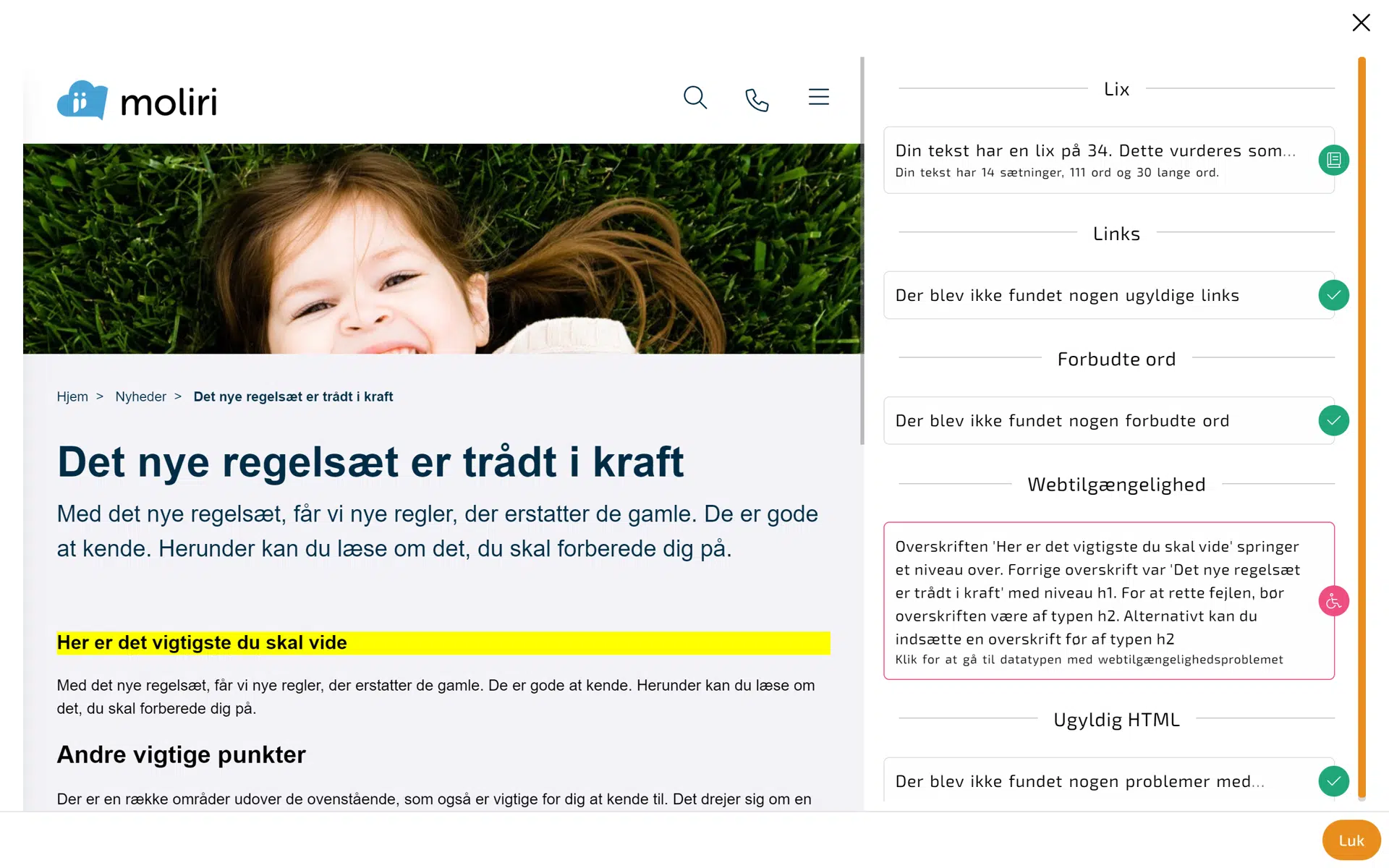 Valideringen kontrollerer dit indhold i realtid, og tjekker blandt andet for webtilgængelighed, døde links, og GDPR-overtrædelser. Er der fejl i dit indhold, bliver de tydeligt fremhævet med en brugervenlig forklaring på, hvordan de rettes. Klik på fejlen og bliv ført direkte ned til det sted i indholdet, hvor fejlen er placeret.
